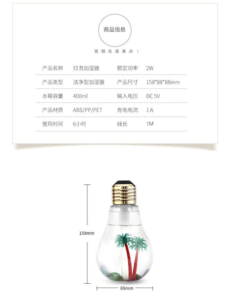 Humidificateur à ampoule colorée de deuxième génération de commerce extérieur domestique, réapprovisionnement en eau d'atomisation de voiture, mini humidificateur USB créatif 400ml