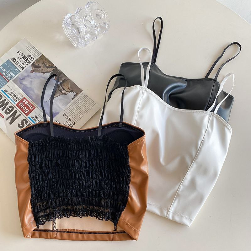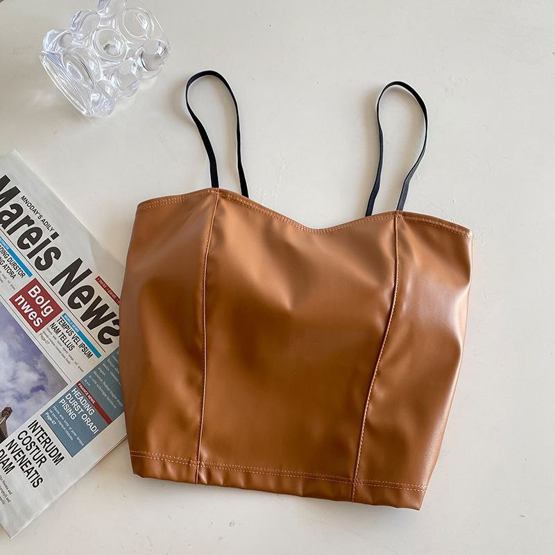 Gilet à bretelles en cuir rétro de style populaire pour femmes, haut ajusté avec coussinet de poitrine court et fixe