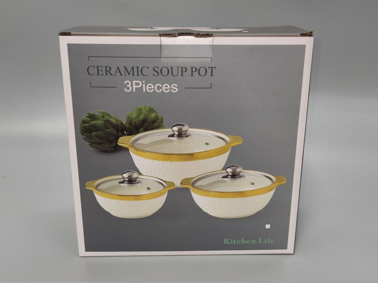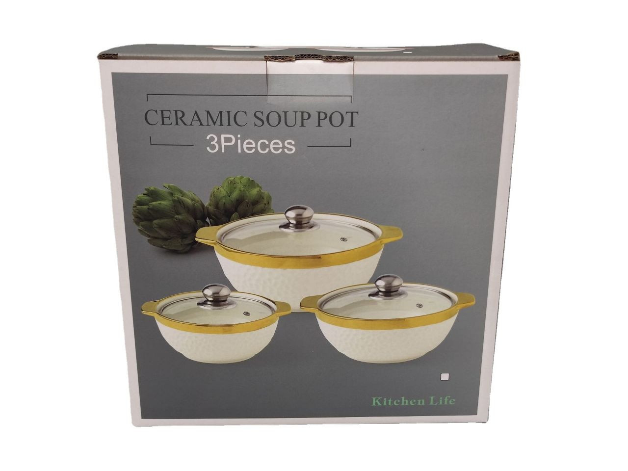 Un ensemble de trois bols de service ou cocottes en céramique empilables, de couleur blanche et de tailles différentes, chacun avec un couvercle en verre et une poignée métallique sur le dessus du couvercle.