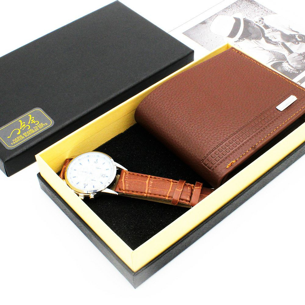 Ensemble cadeau comprenant une montre-bracelet et un portefeuille marron en cuir texturé, présentés dans un coffret noir.