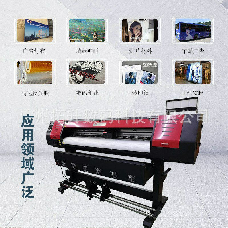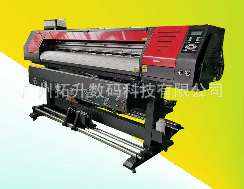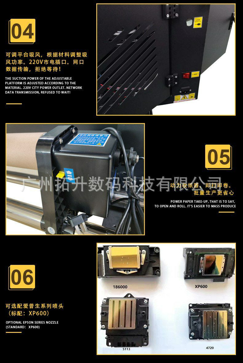 Composants notables : Moteur haute vitesse, plateforme entièrement en aluminium, têtes d'impression Epson, fonction de levage de la pile d'encre, système d'enroulement automatique du papier, et séchage infrarouge.