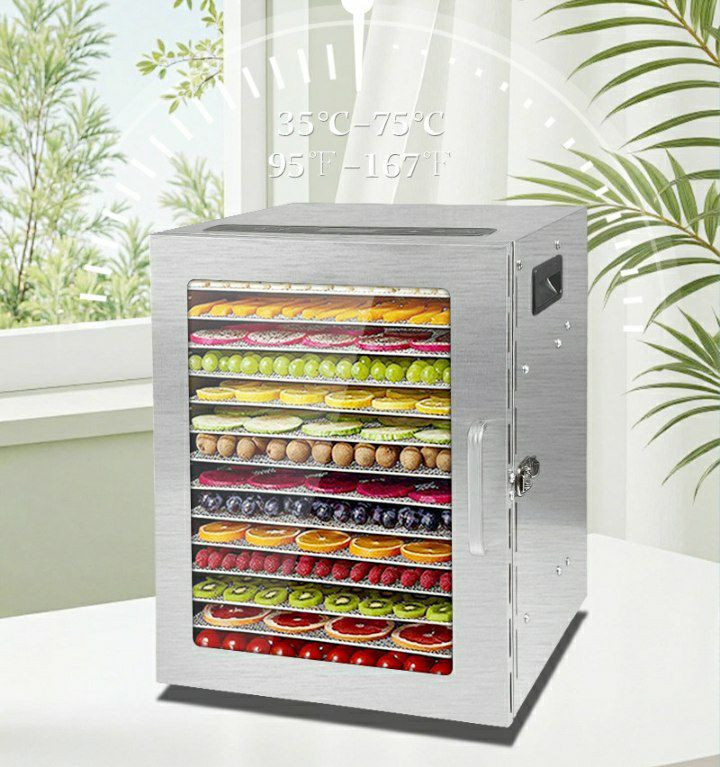 Le déshydrateur est couramment utilisé pour sécher des fruits (comme les tranches d'agrumes et de kiwis visibles sur l'image), des légumes, des herbes, et même de la viande.