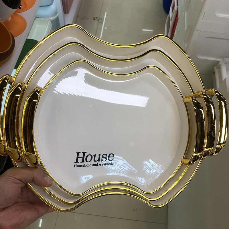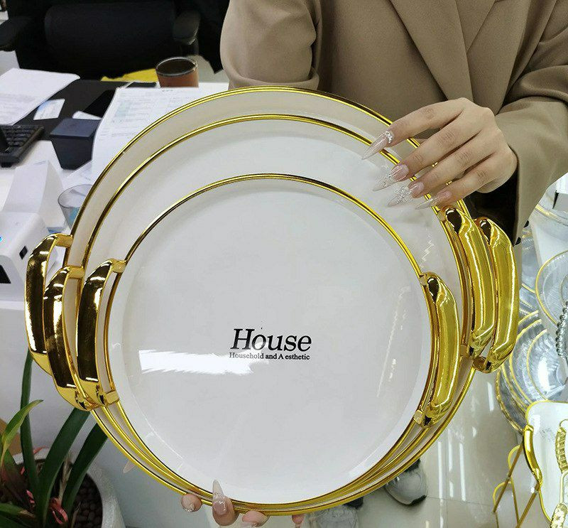 Ensemble de trois plateaux de service blancs et noires de différentes tailles, avec des bords dorés et des poignées dorées en forme de perles et autres.