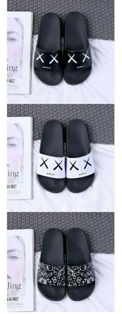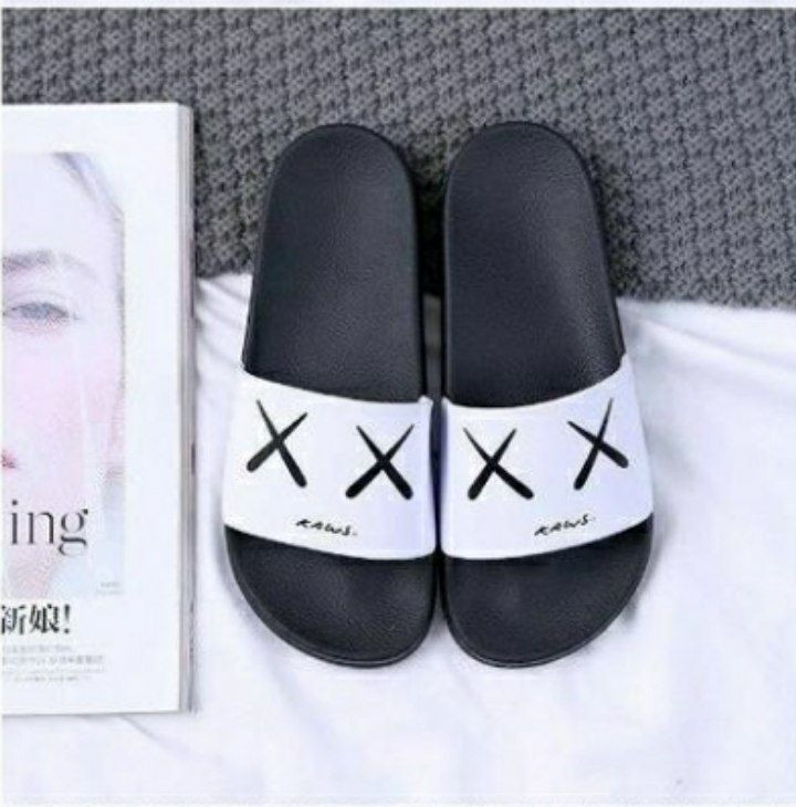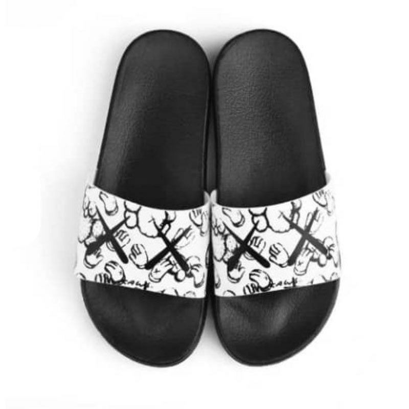 pantoufles Shopee populaires, sandales Kaws de style claquettes, disponibles en noir et blanc avec de différents motif "X.X" ou un motif camouflage/graphique.