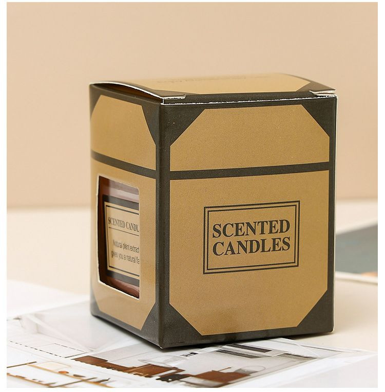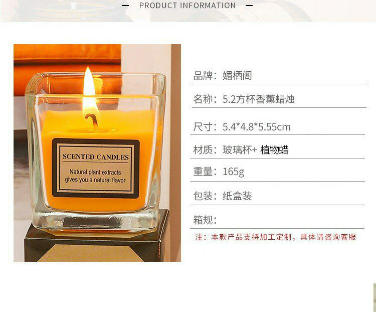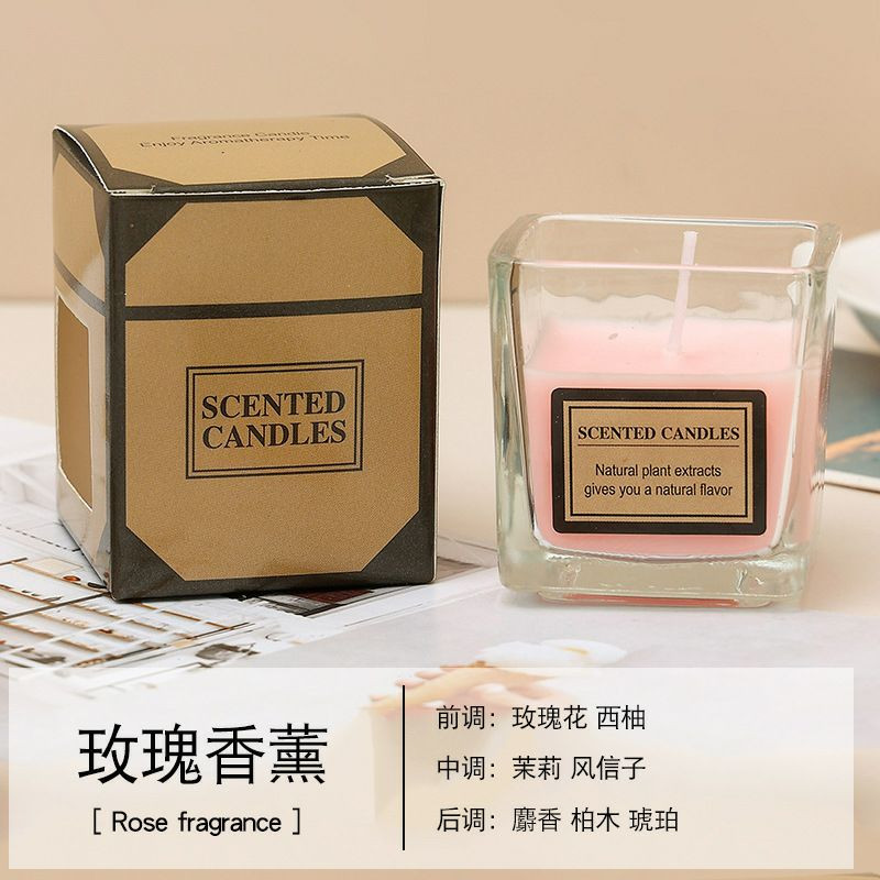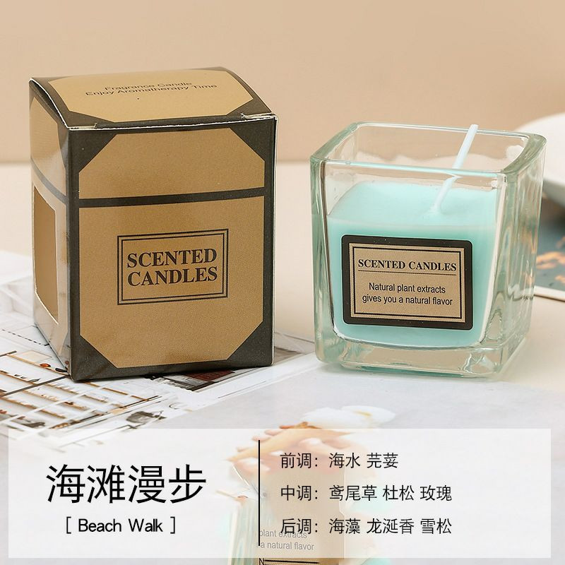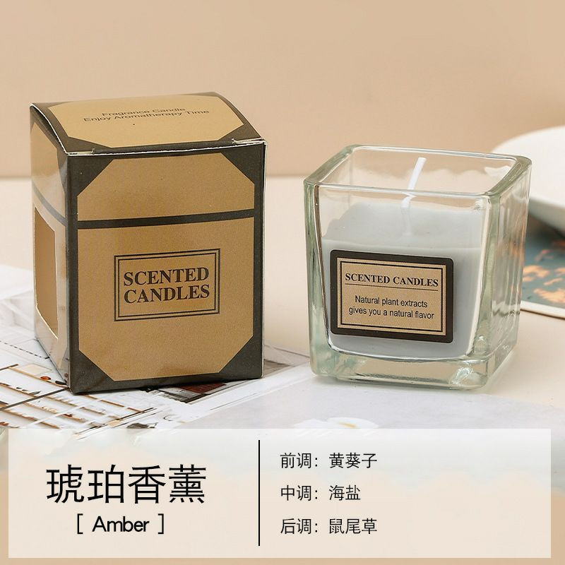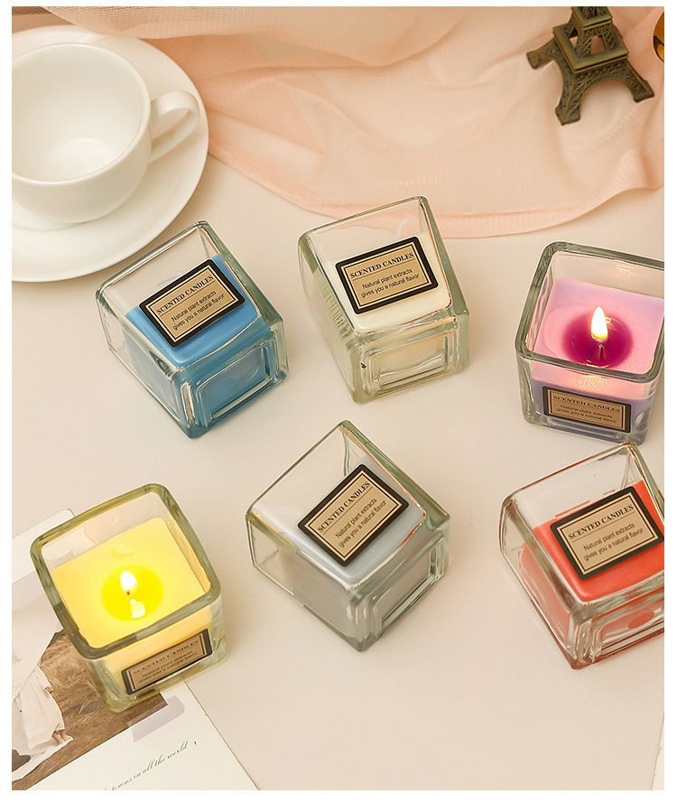 Bougies parfumées générique en pot de verre carré avec sa boîte d'emballage, fabriquée à partir d'extraits naturels de plantes.