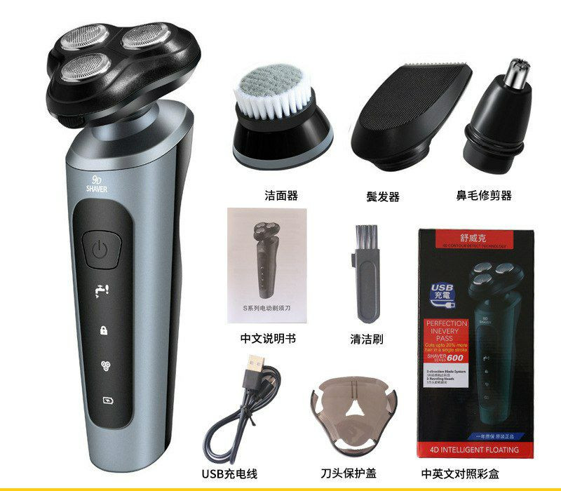 Kit de rasoir électrique multifonctionnel 4-en-1 avec têtes rotatives 9D, incluant des accessoires pour le rasage, la tonte des cheveux, des poils de nez et le nettoyage du visage.