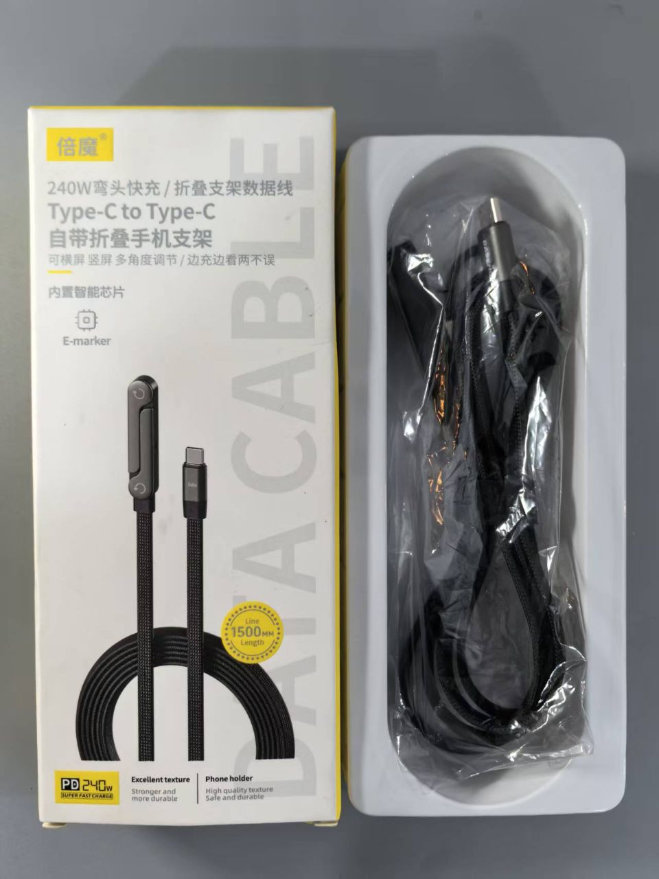 Caractéristiques physiques : Câble tressé d'une longueur de 1500 mm avec une puce E-marker pour une charge sûre.