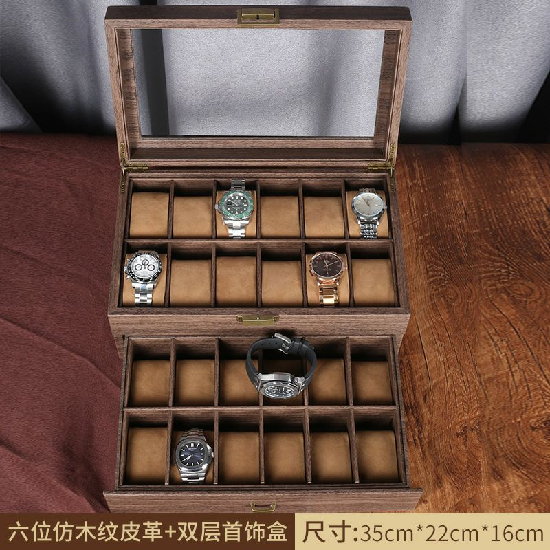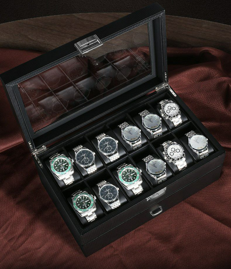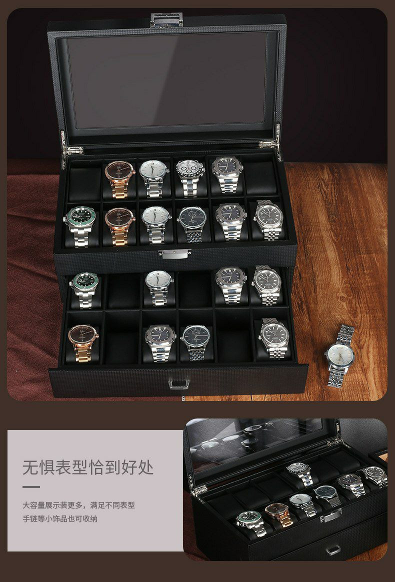 Double couche pu 24 bits boîte de rangement de montre boîte à bijoux en fibre de carbone boîte d'affichage de bracelet boîte-cadeau bracelet