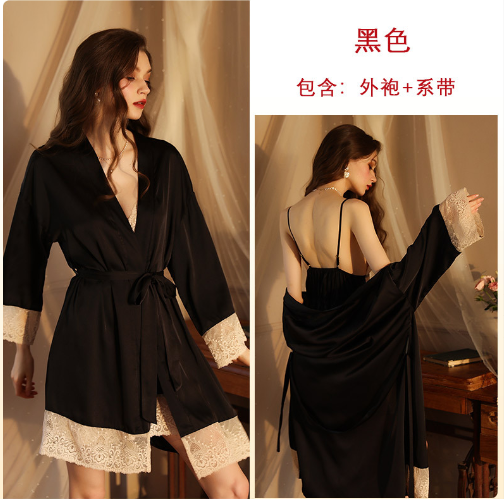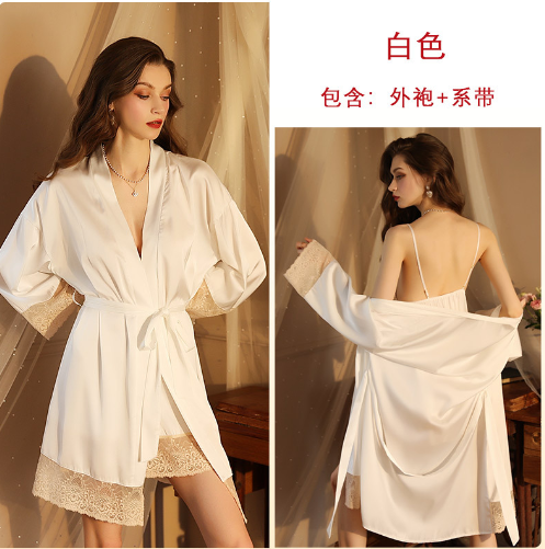 Seductive Private Sexy Nightwear Ladies Long Sleeve Satin Lace Up Robe Tunic